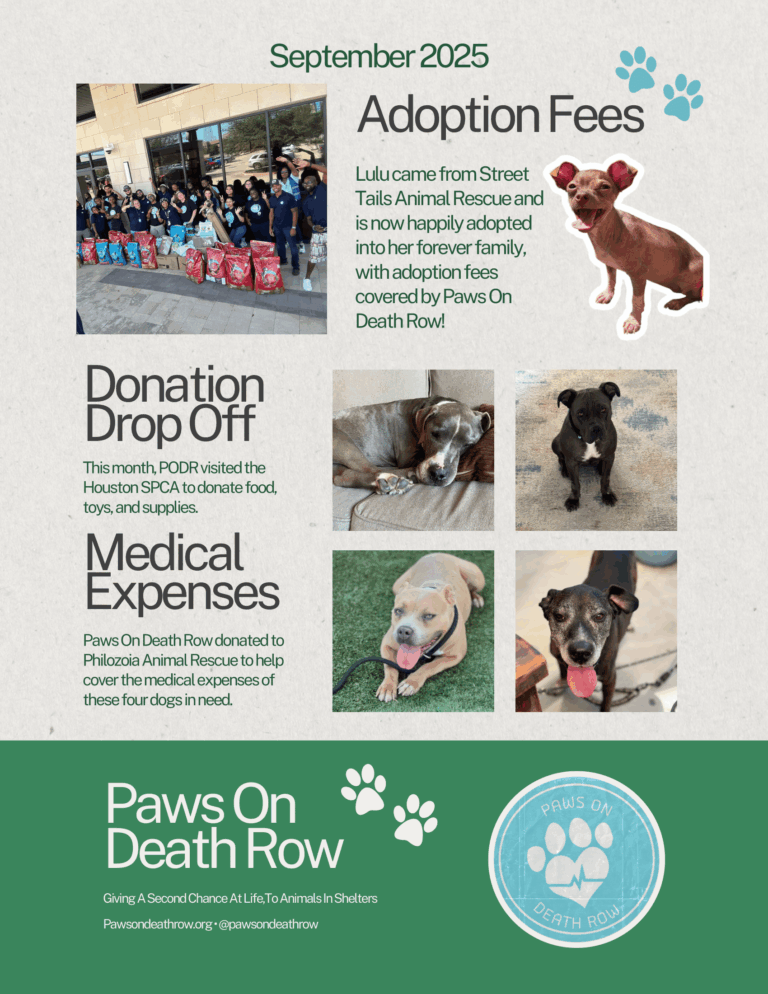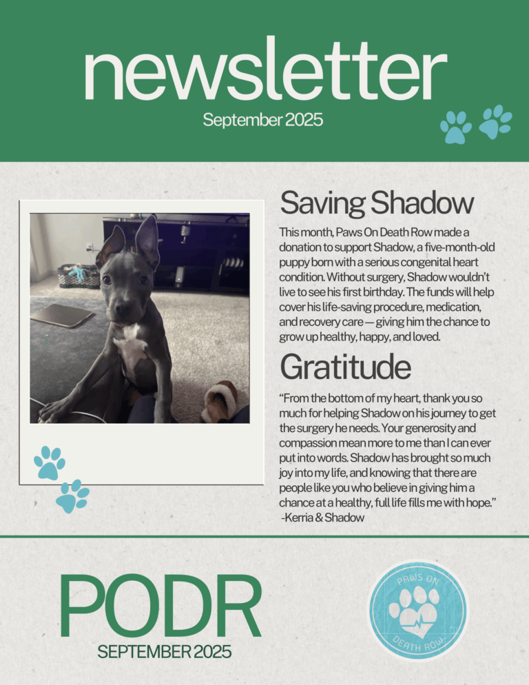 Paws on Death Row is dedicated to saving animals in need by providing resources to shelters and working to build a rescue facility of our own. Our goal is to help animals find loving homes, sponsor critical medical procedures, and provide shelters with essential supplies to give animals a fighting chance. Learn more about our mission here.